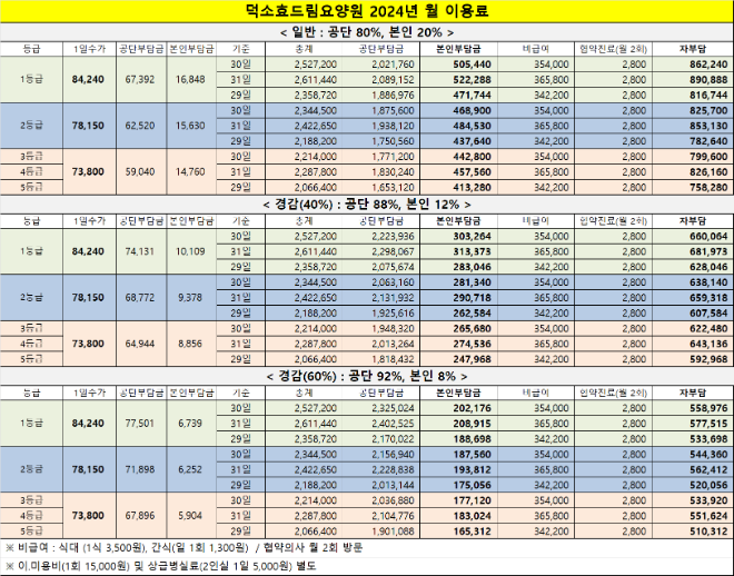 안녕하세요, 덕소효드림요양원입니다. 2024년도 본인부담금 수가표를 첨부 파일로 올려드렸으니 확인해 주시기 바랍니다. |