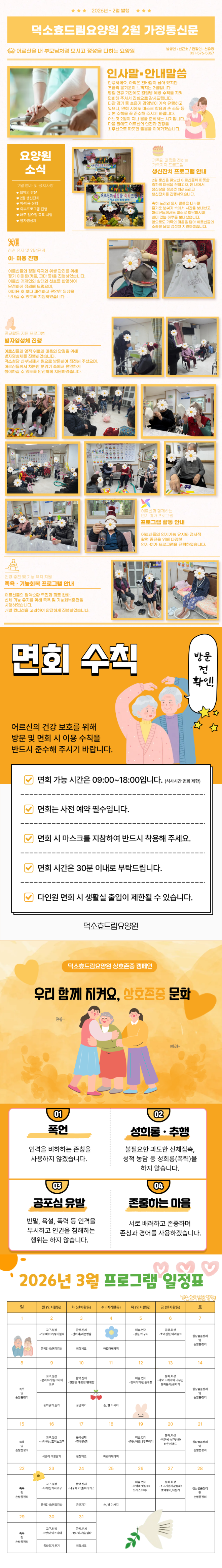 2026년 2월 가정통신문입니다. 어르신들께서 지내신 일상과 활동 소식을 공유드리며, 보호자님께서 안심하실 수 있도록 주요 안내사항을 함께 전해드립니다. |